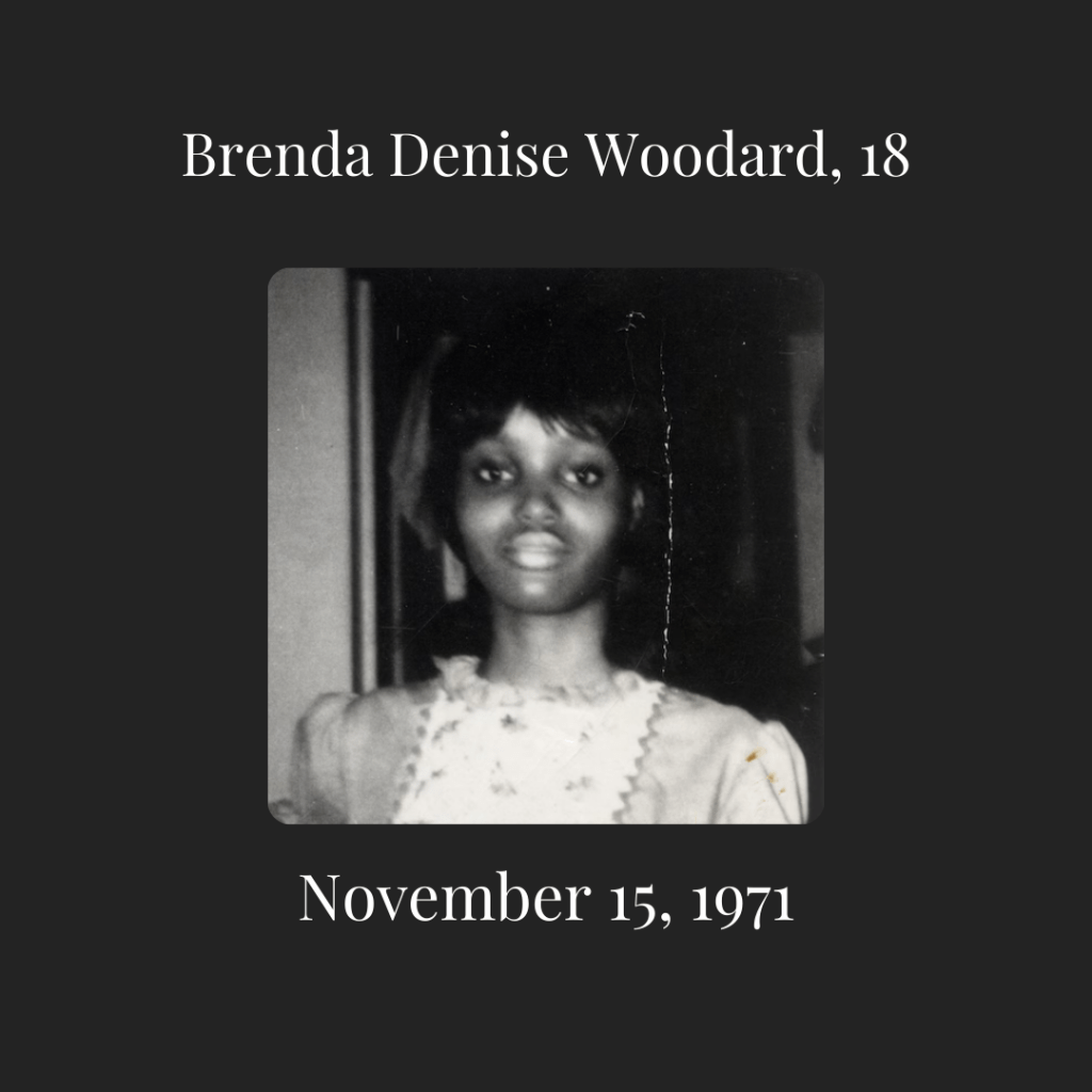 Brenda Denise Woodard was an 18 year old high school student from Baltimore, Maryland. She lived with her parents, two brothers, and two sisters along Maryland Avenue. Brenda was outgoing and enjoyed spending time at local restaurants, such as Ben’s Chilli Bowl, with friends after school.